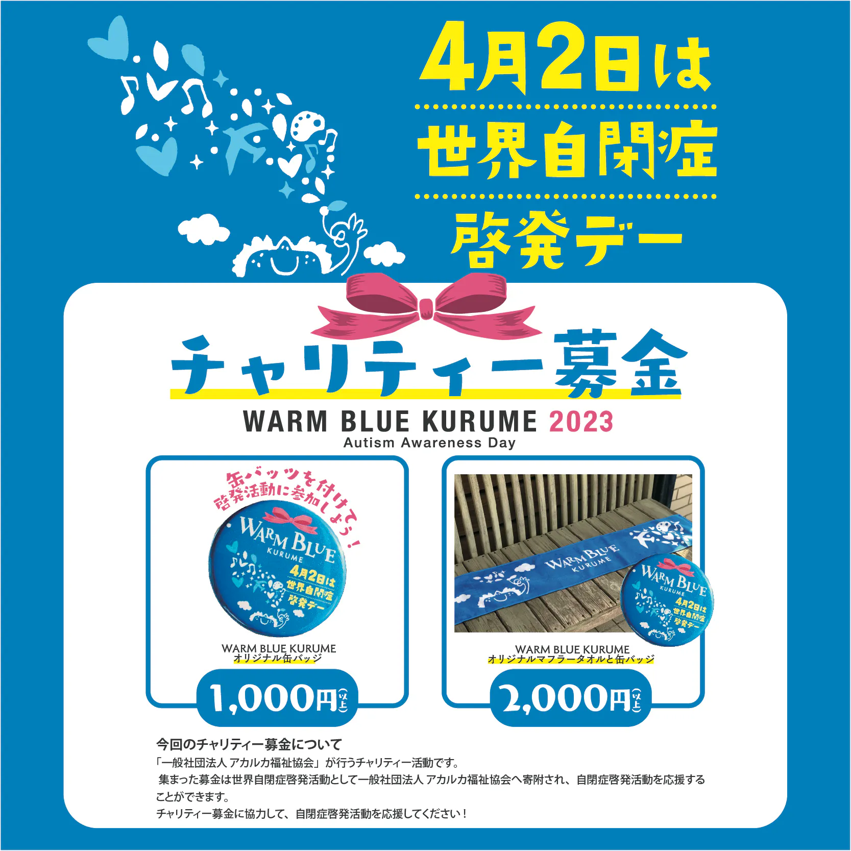 2000円以上の募金でWarm Blue KURUMEオリジナル缶バッジ&マフラー。