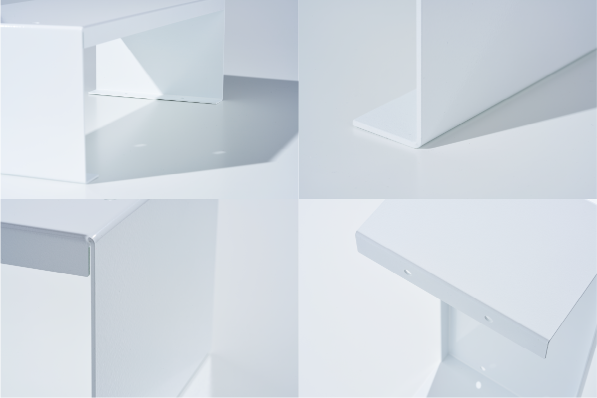 原材料は、厚み2㎜のアルミニウム合金板を加工して製造します。溶接は用いず1枚の板材から曲げ加工で制作します。