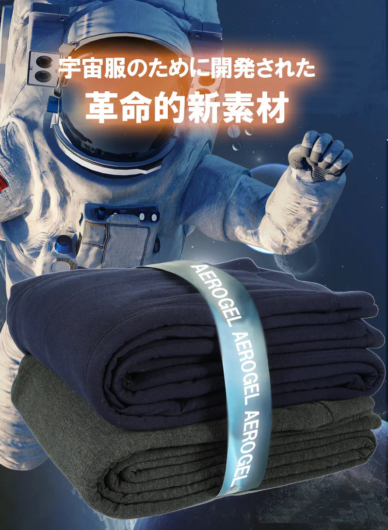 - 宇宙服のために開発され、液体窒素をも断熱する新素材エアロゲルを採用した、とても温かいインナーウェア