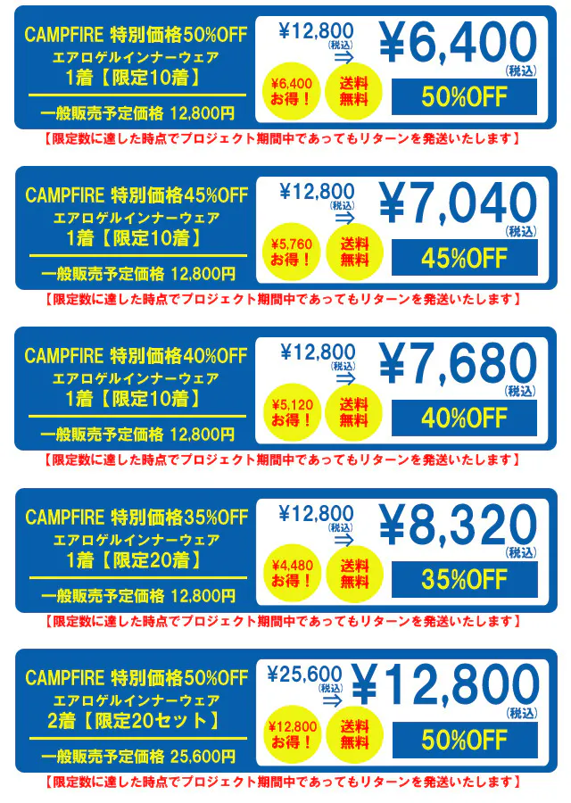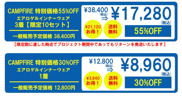 2024/12/03 17:14以前よりご支援いただいた「エアロゲルインナーウェア」プロジェクトへの温かい応援、本当にありがとうございました!今回は、さらにパワーアップした新しいプロジェクトをご紹介します! なんと「エアロインナーゲル」が上下セットとなって登場しました! お求めやすい価格でご提供することが可能となりました。断熱素材エアロゲルの優れた性能はそのままに、トップスとボトムスのセットで全身を暖かく包み込む仕様になっています。これまで「インナーは暖かいけど、ボトムもあればもっと便利」というお声をたくさんいただき、その声にお応えする形で上下セットが実現しました。 外出時はもちろん、家でのリラックスタイムやアウトドアでも、全身を寒さから守ります。新たなプロジェクトはすでにスタートしています! リンクはこちらです: [プロジェクトプロジェクトページを見る https://camp-fire.jp/projects/811208/view もっと見る