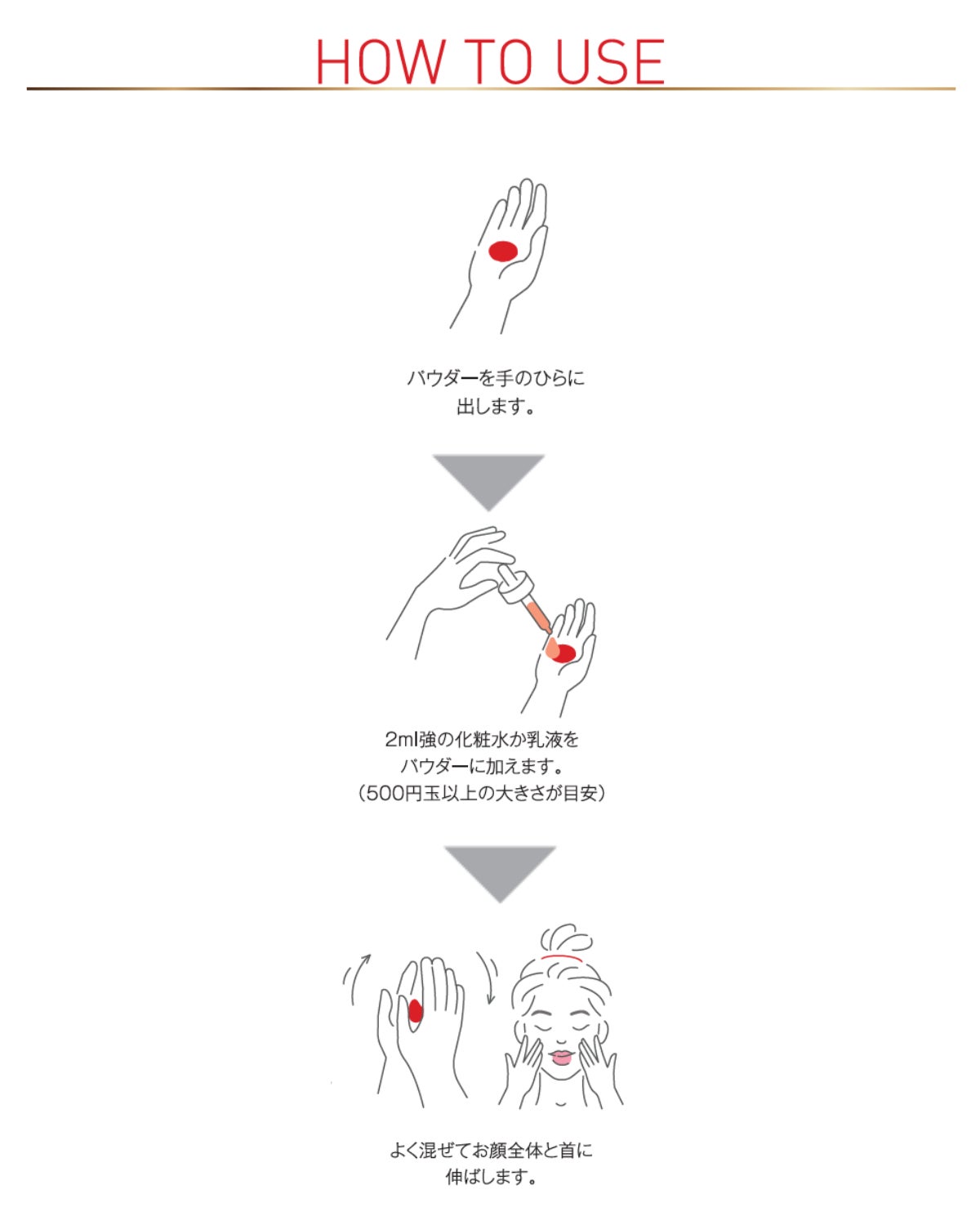 洗顔後のお肌に1包のパウダーを手のひらに出し、お持ちの化粧水や美容液と混ぜ合わせ溶かしてから優しくお顔に馴染ませて下さい。