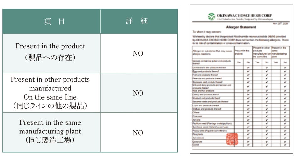 ▶︎ 沖縄長生薬草のNMNには、次のアレルゲンが含まれていません。