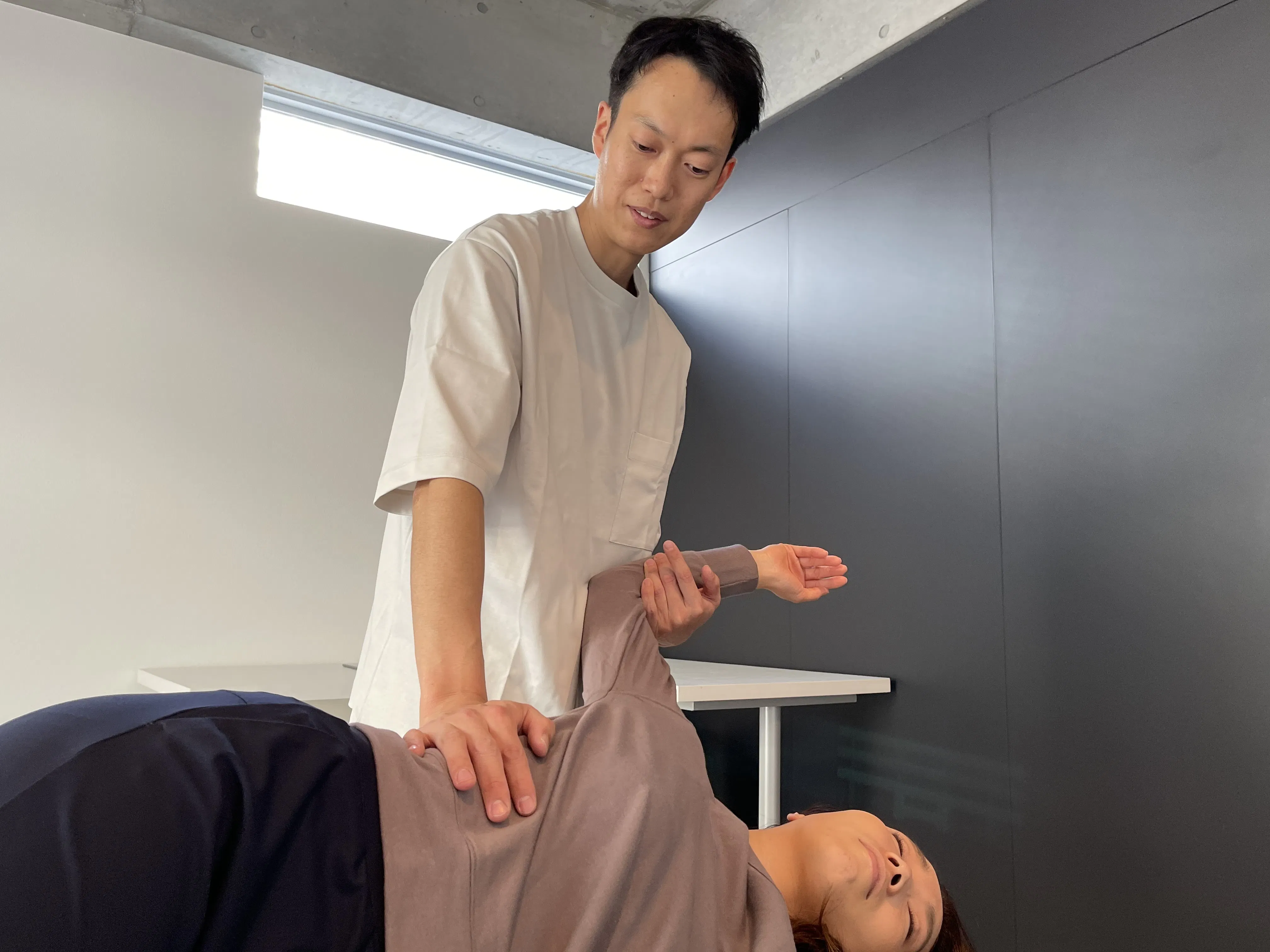 整骨院では初心者同士で施術の練習をします。