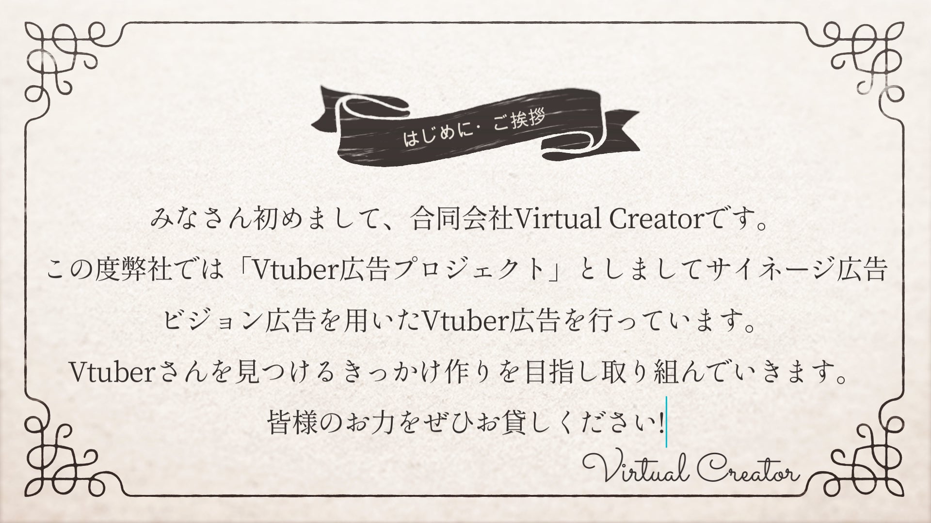 このプロジェクトを通して新しいVtuberさんを見つけるきっかけ作りを促進していきたいと思っております。今まさにVtuber界隈は新時代に突入したばかりです。激動するこの業界で一人でも多くのVtuber様、Vライバー様を支援する事が私達合同会社Virtual Creatorのミッションであると考えております。