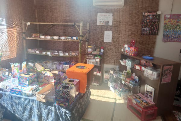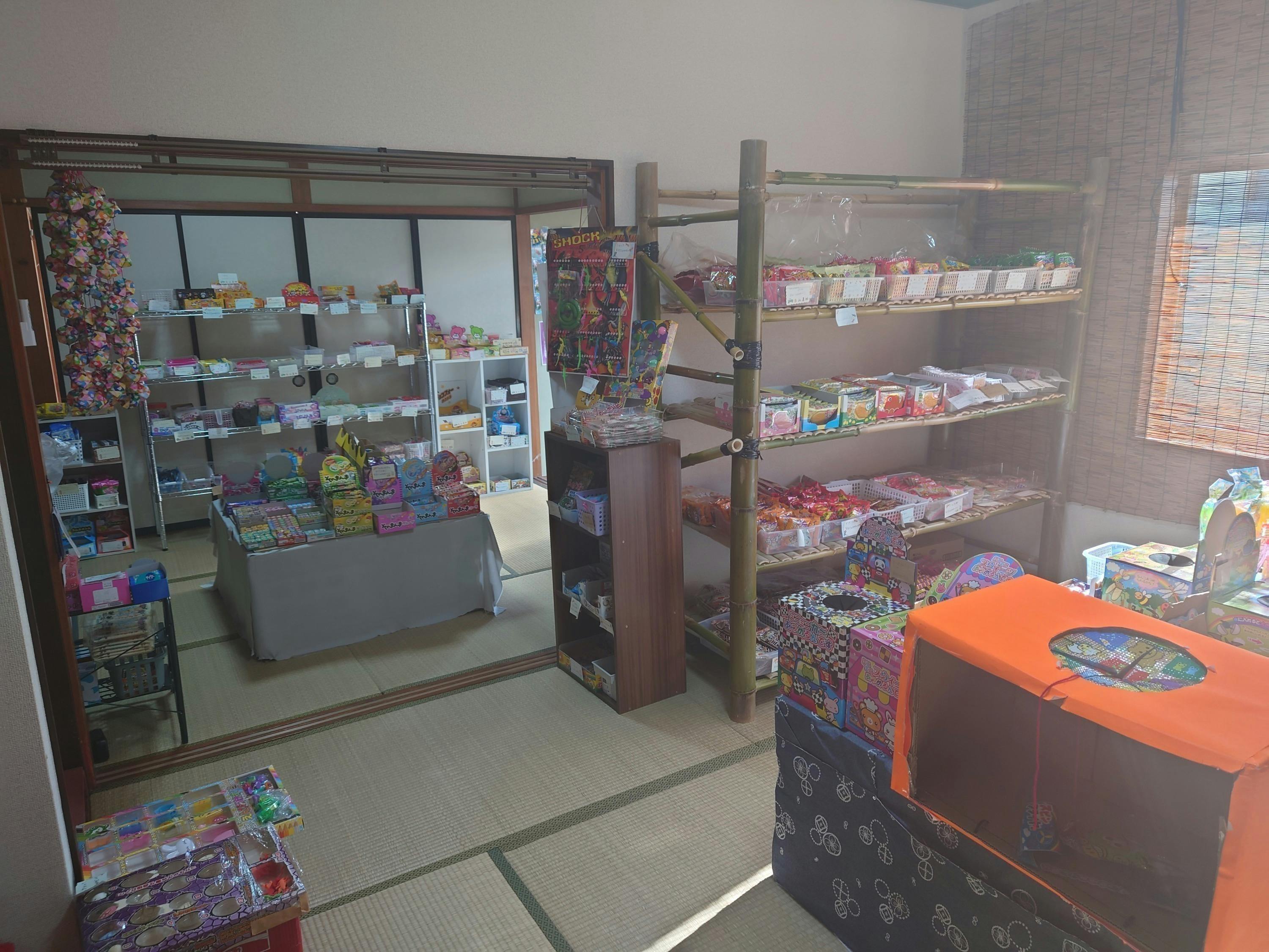 2022年7月に福島県いわき市内に1号店をOPENしました。築40年の一軒家をお借りした小上がりスタイルの店内となっており、コンビニやスーパー等とは一味違う昔ながらの駄菓子屋の雰囲気が味わえます。陳列棚は既存の棚や近所の方からいただいた竹を加工して作成、陳列しています。また、企業さんが使い古したパレットを加工した棚もあり、コストを抑え環境に配慮した店内となっています。また、靴を脱いで買物をするスタイルに拘り、ご来店いただいたお客様の安心感や清潔感を大事にしております。
