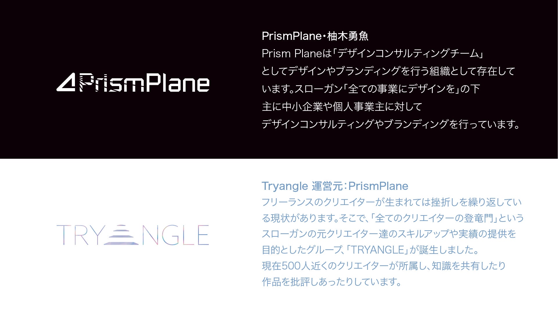 PrismPlaneがTRYANGLEを運営しています。 フリーランスクリエイターとして業界に入ったとしても、実力不足で挫折してしまうのが現状です。 そこで、「全てのクリエイターの登竜門」というキャッチフレーズを掲げ、実績とスキルアップを目指すグループ「TRYANGLE」が生まれました。現在、500人以上のクリエイターが所属しており、知識の共有や作品の批評を行っています。