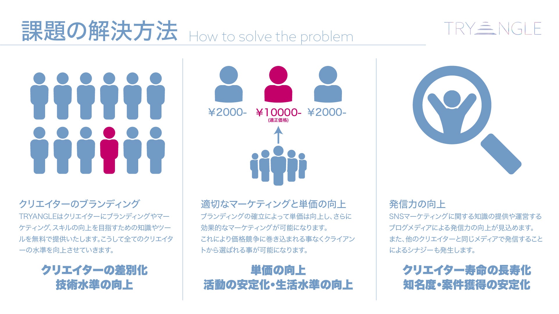 TRYANGLEはクリエイター向けに、ブランディングやマーケティング、スキル向上のための知識やツールを無料で提供しています。これによって、全てのクリエイターの水準を向上させます。