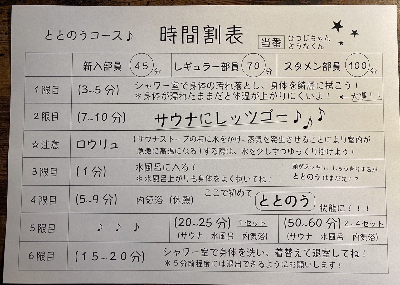 サウナ初心者の方でも安心して”ととのう”ことができるよう部活のメニュー表のような