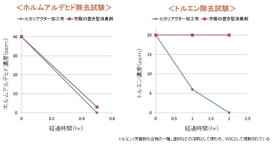 ホルムアルデヒドはどちらも除去できていますが、トルエンは市販の消臭剤では除去できていません。トルエンは香料など同じ化合物です。トルエンが除去できないということは香料成分も除去が難しいということです。市販の消臭剤ではよく花などの香りが付いているものがあります。多くの消臭剤では香料成分を除去できないので香りを付けることができます。光触媒はそんな香りの基を分解するので、香害(スメルハラスメント)にも対応できる可能性があります。