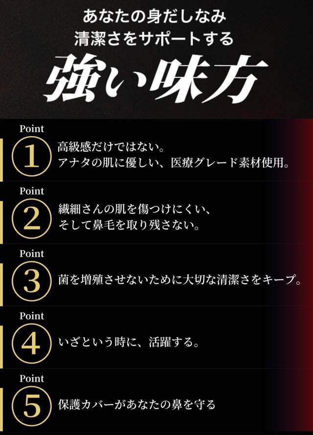 「人生に多くの選択肢を」を企業理念に、世界中から様々な製品を日本に紹介し、日常に新たな選択肢を増やし生活を豊かにするための活動をしています。 この鼻毛カッターは、「いい歳だから身だしなみには一応気を付けるけど、忙しくて鏡を見る余裕もないんだよなぁ~」というアナタ(というよりもズボラなワタシ)ために、ぜひ使ってラクして欲しいと思った商品です。 私どもの製品でみなさんの毎日がワクワクなるような生活になればと思っております。よろしくお願い致します。
