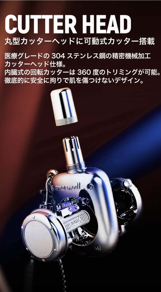 内臓式の回転カッターは360度のトリミングが可能です。徹底的に安全に拘りで肌を傷つけにくいデザインです。
