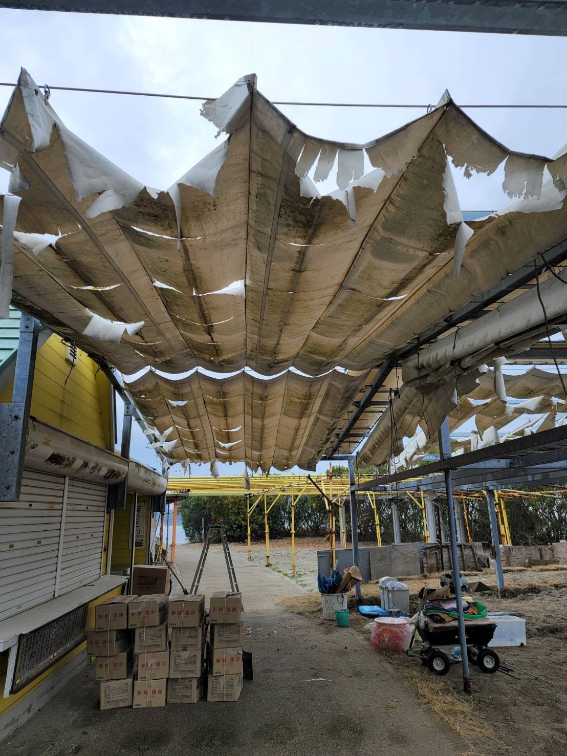 元々の計画では、今期は簡易的なシートへと交換し最低限の日よけエリアとして乗り切る予定でしたが、安全性などに不安を感じる状況となりました。