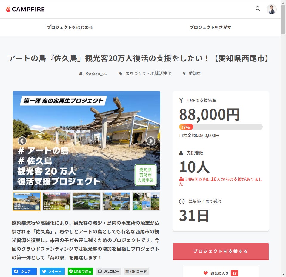 達成率17%/支援者数10名/お気に入り数17名(執筆時)と