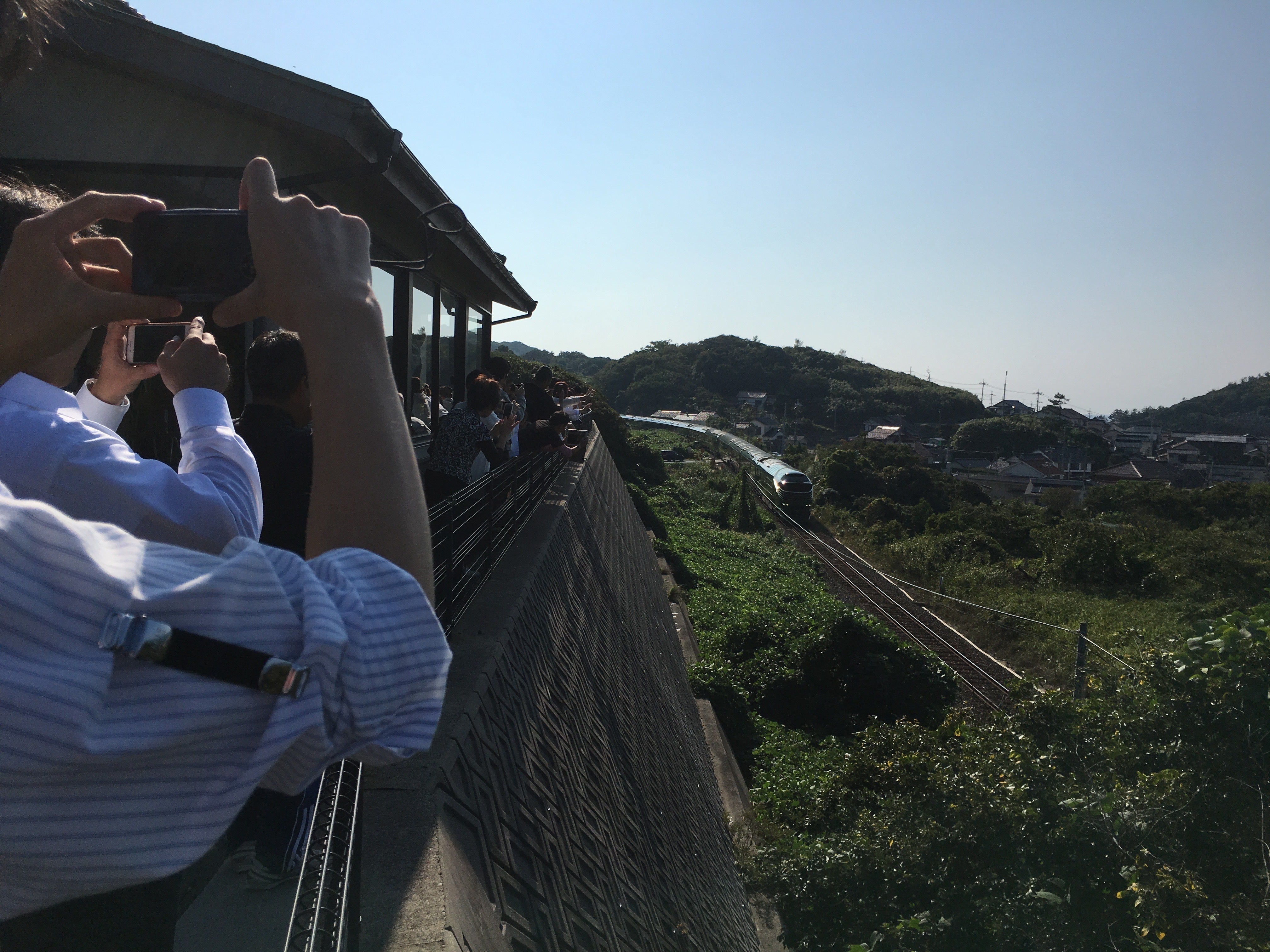 写真は2017年6月運行を始めた瑞風を見ようとたくさんの方がカメラを手にテラス席、駐車場に集まっている様子。