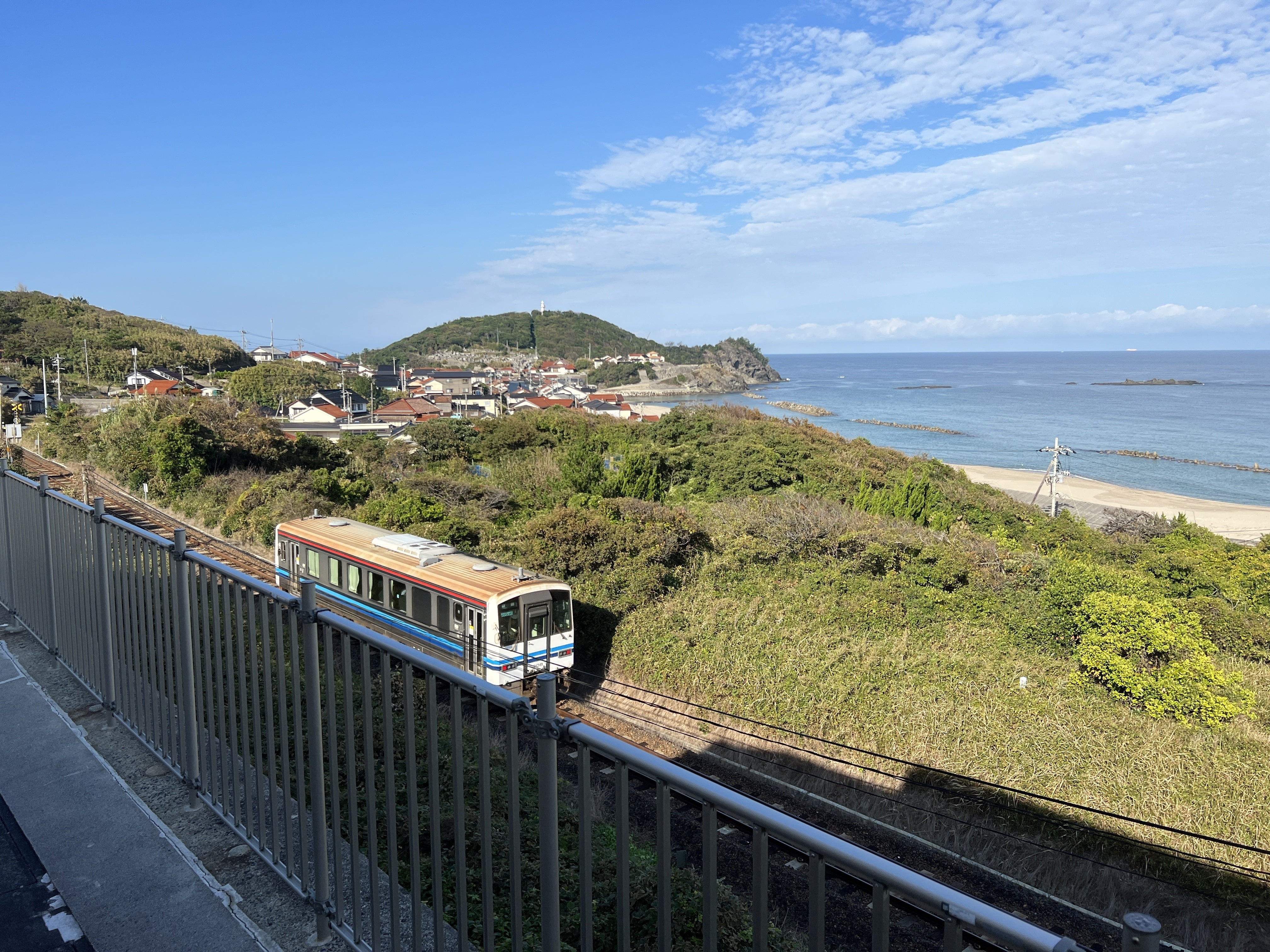 カフェ席からは電車も見ることができます。車両数は少ないですが、その分背景の日本海が大きく見え、カフェ席からは「ああ!もう行っちゃった、次は何分に来るんだろう。」という会話も聞こえてきます。