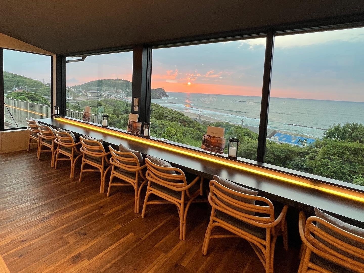 店内席からも夕陽をご覧になることができます。夕陽タイムの時間は普段のフードメニューの一部、スイーツメニュー、ドリンクをお楽しみいただけます。下には普段頼むことができるフードメニュー・スイーツ・ドリンクメニューも載っているので、そちらもご覧になってください。