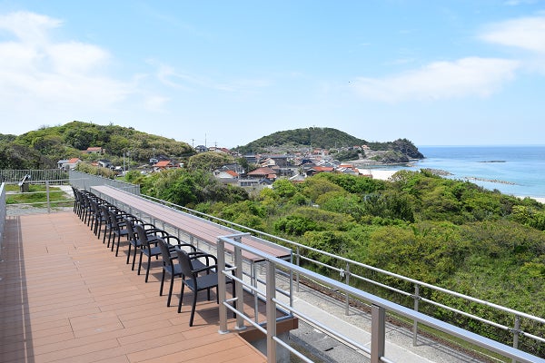 カフェ席からは雄大な日本海、灯台と五十猛の街並み、そして五十猛神話でスサノオノミコト、その子イソタケルノミコトが上陸されたとされている「神島」を見ることができます。