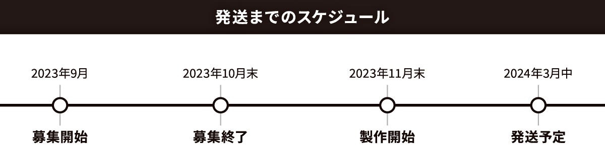 リターン品について、2024年3月頃のお届けを予定しておりますが、ご支援状況によりお届けのタイミングが前後する可能性がございます。予めご了承ください。