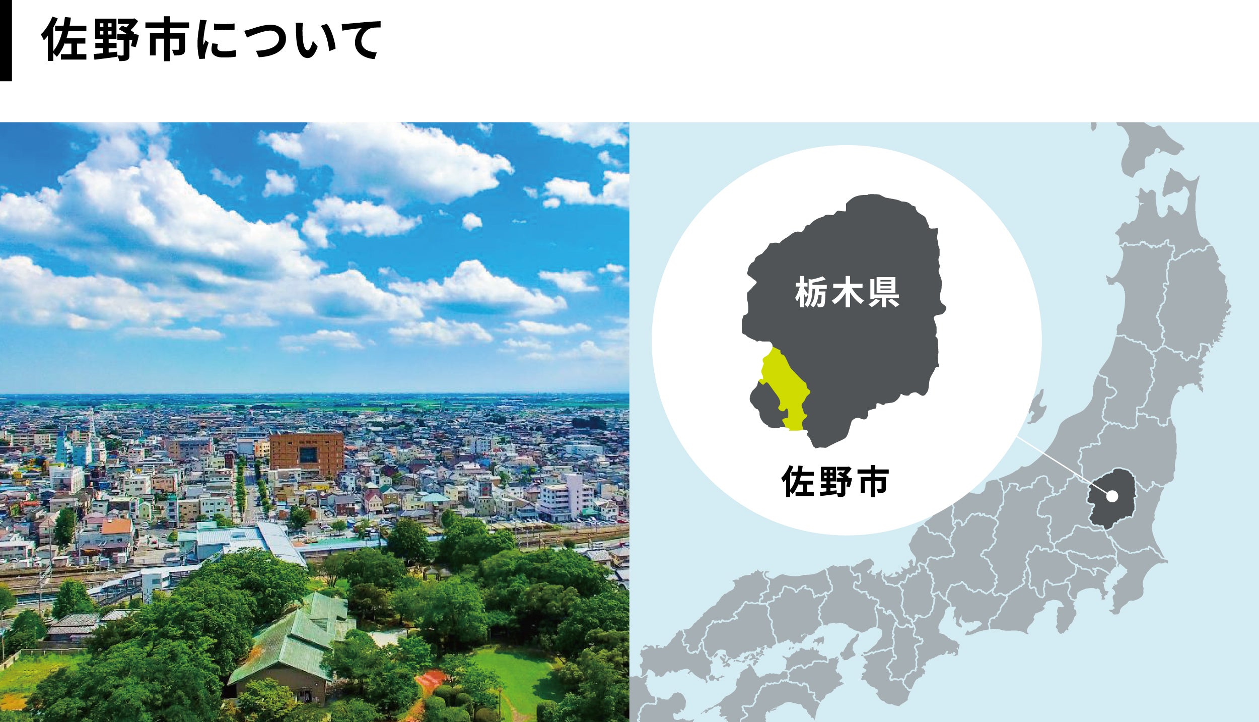栃木県の南西部に位置し、人口は約11万5千人。緑豊かな森林や美しい清流など自然環境に恵まれた中山間エリア、住宅や産業基盤が集積する都市エリア、農業を展開する田園エリアが揃う街です。都心からは高速バスで約90分、電車なら80分程度で、都心からのアクセスも良好でありながら関東で有数の規模を誇る山城であり、藤原秀郷公が築いたといわれる「唐沢山城跡」、一千年の歴史を持つ「天明鋳物」など、歴史・文化的な資源が市内各所に見られるのも魅力です。