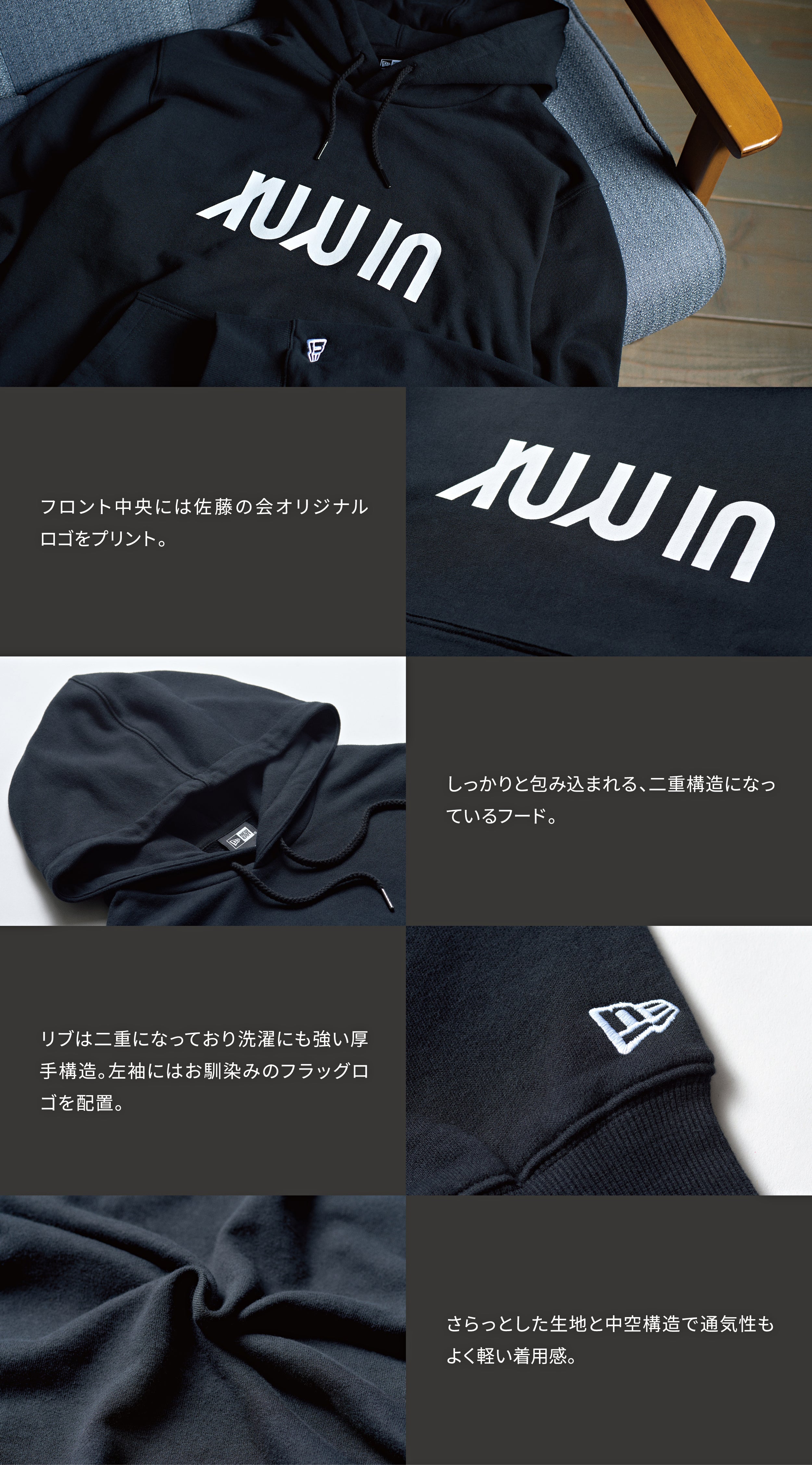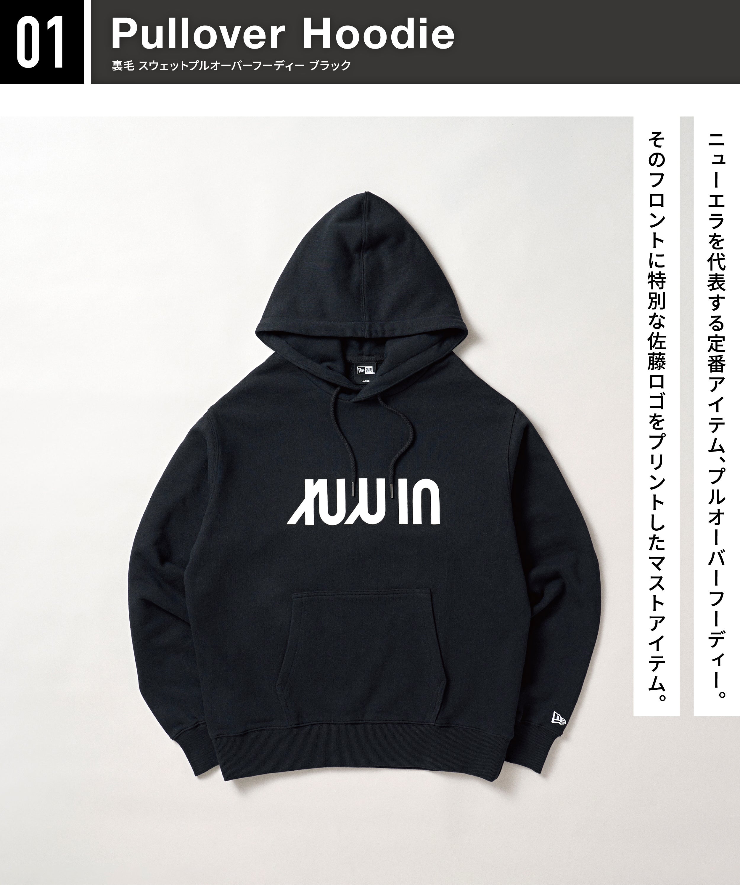 佐藤さんのための特別なロゴをフロント中央にプリントしたデザイン。袖先にもフラッグロゴをワンポイントとしてレイアウト。ゆったりした着心地に仕上げたニューエラオリジナルのシルエットに、11オンスのコットン生地を採用。裏毛スウェットの為、シーズンを問わず長く着用することが可能なプルオーバーフーディーです。