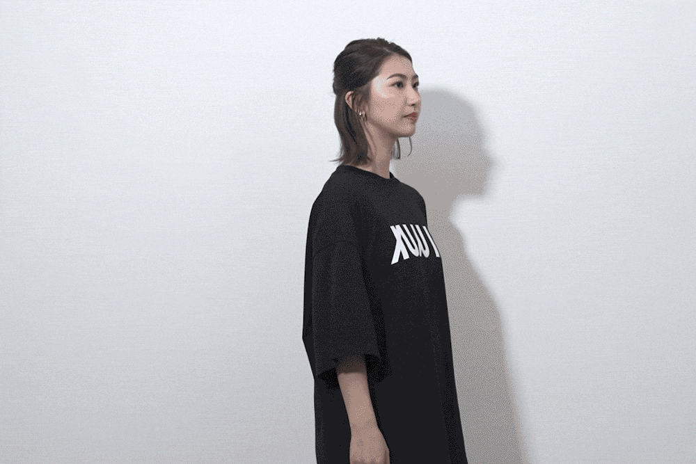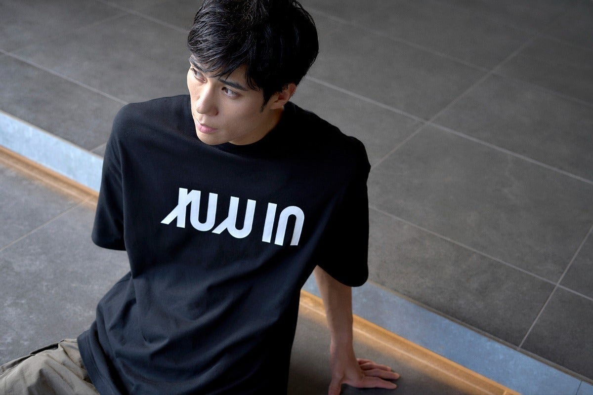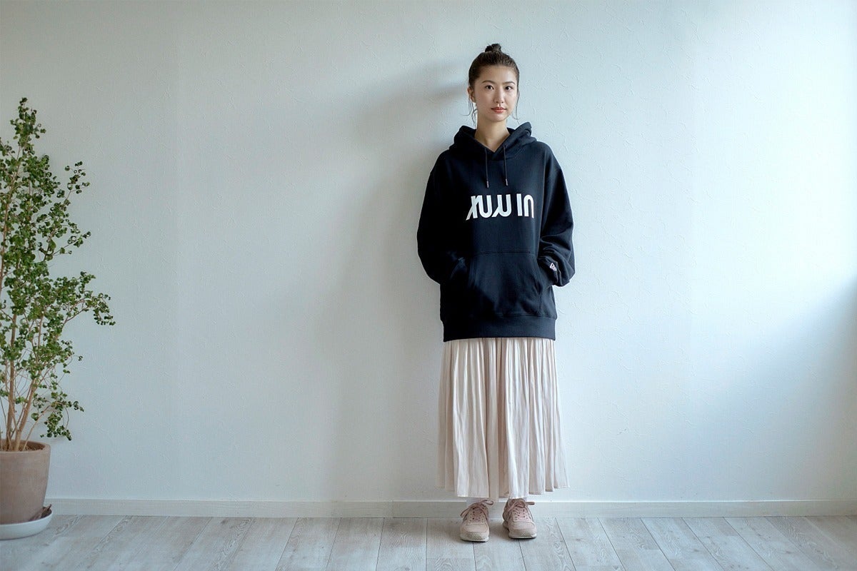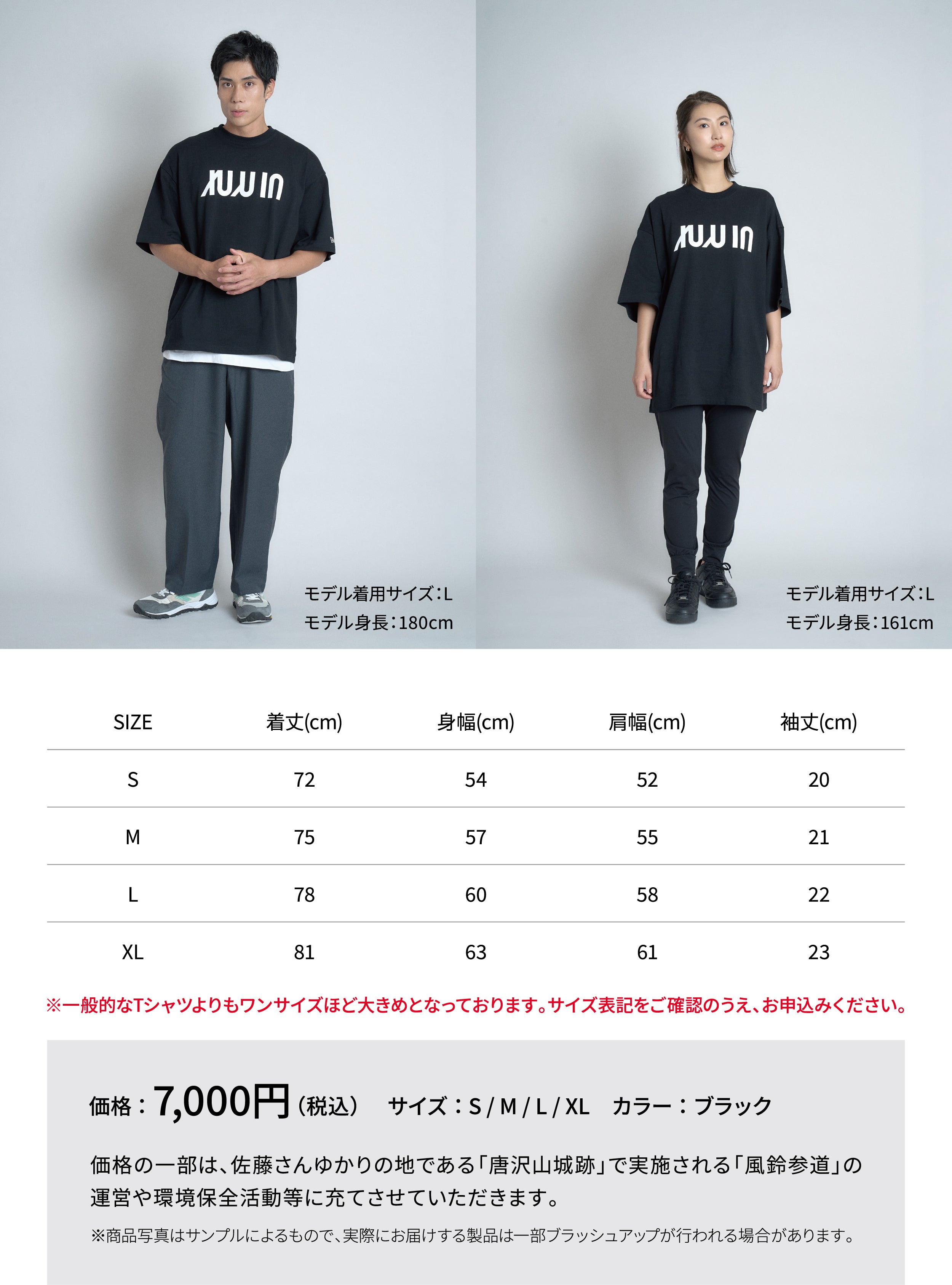 人気のブラックボディに、佐藤さんのための特別なロゴをフロント中央にプリント。ゆとりある着心地のオーバーサイズドなシルエット。