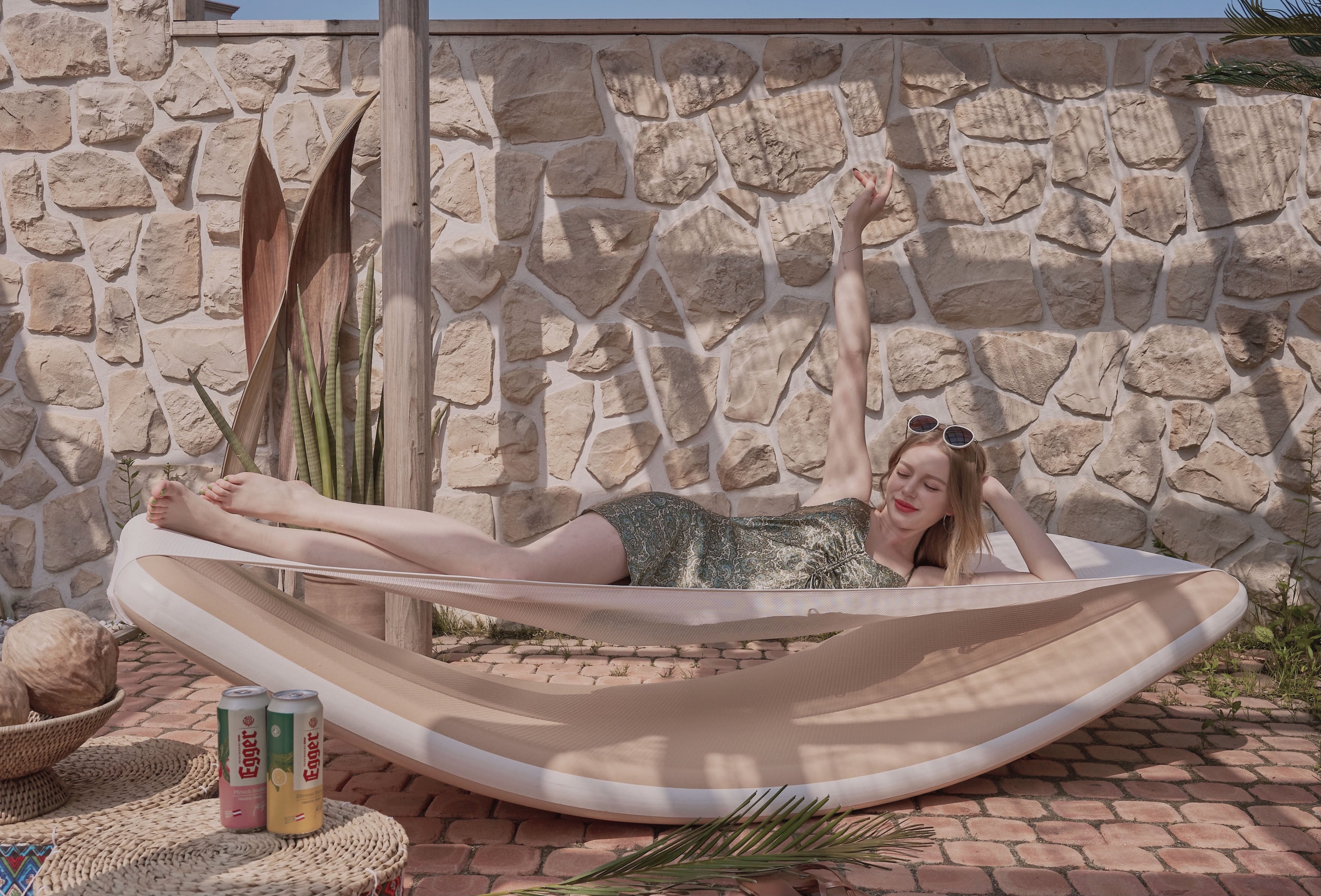 通常、木の枝やハンモックスタンドに吊るして組み立てるハンモックですが、本商品はエアマットレス部分に空気を注入し、ハンモックとなるメッシュが引っ張られることによって「無重力」な寝心地が実現し、組立不要・屋内外場所を問わず、どこでも設置可能となっております。