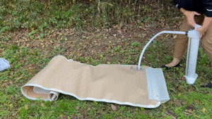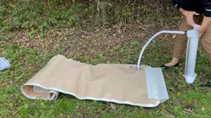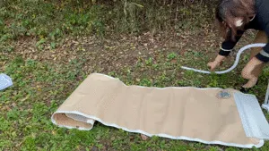 圧力ハンドポンプを使用して空気を抜き、商品の端から順に丸めてコンパクトにします。空気を抜く際は、本体を開栓状態にしてください。最後に付属のバンドを締めてください。