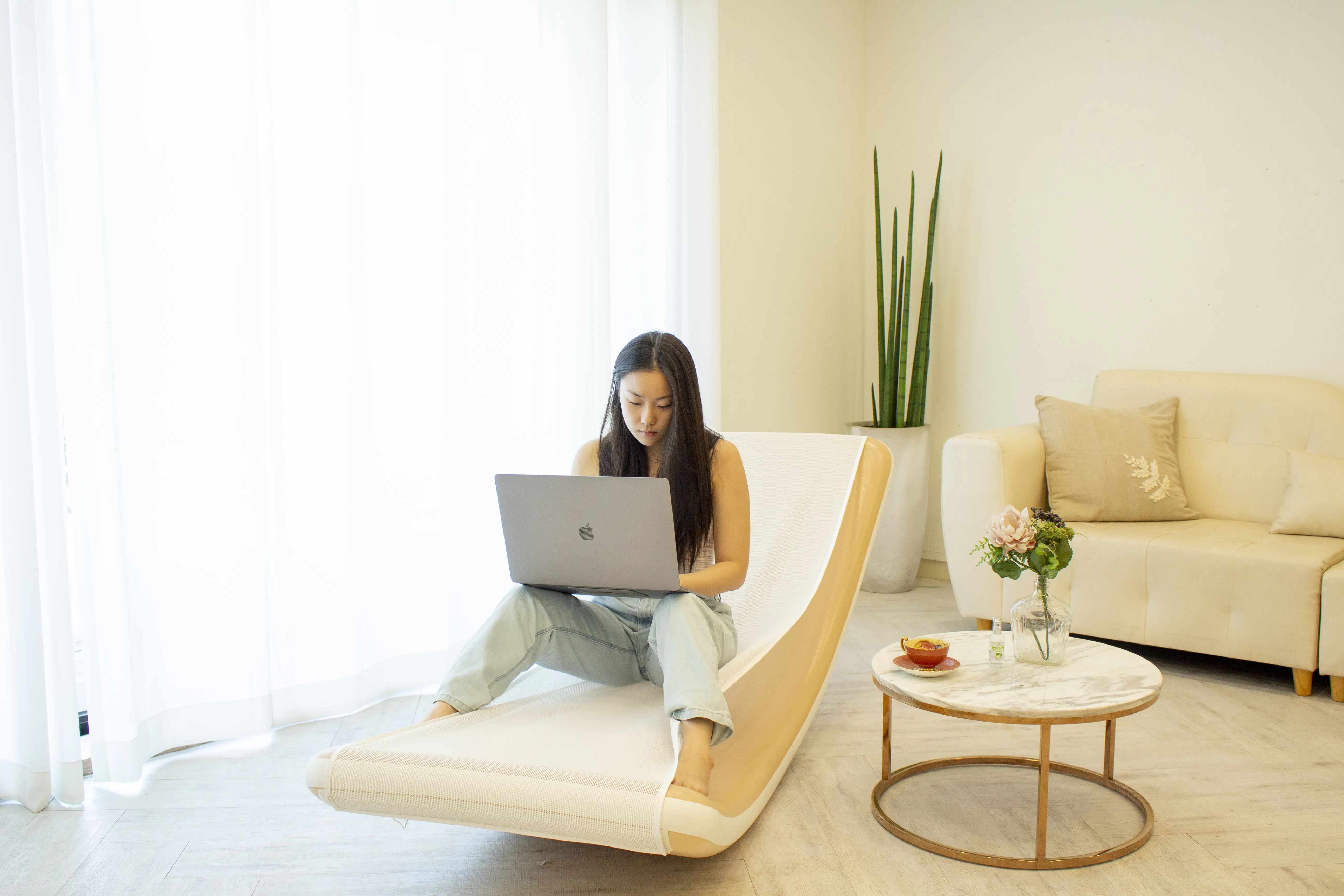 (昼間はベッドシーツを干していたり、コーヒーを飲みながら本を読みたかったりして、寝室ではくつろぎにくいものです)
