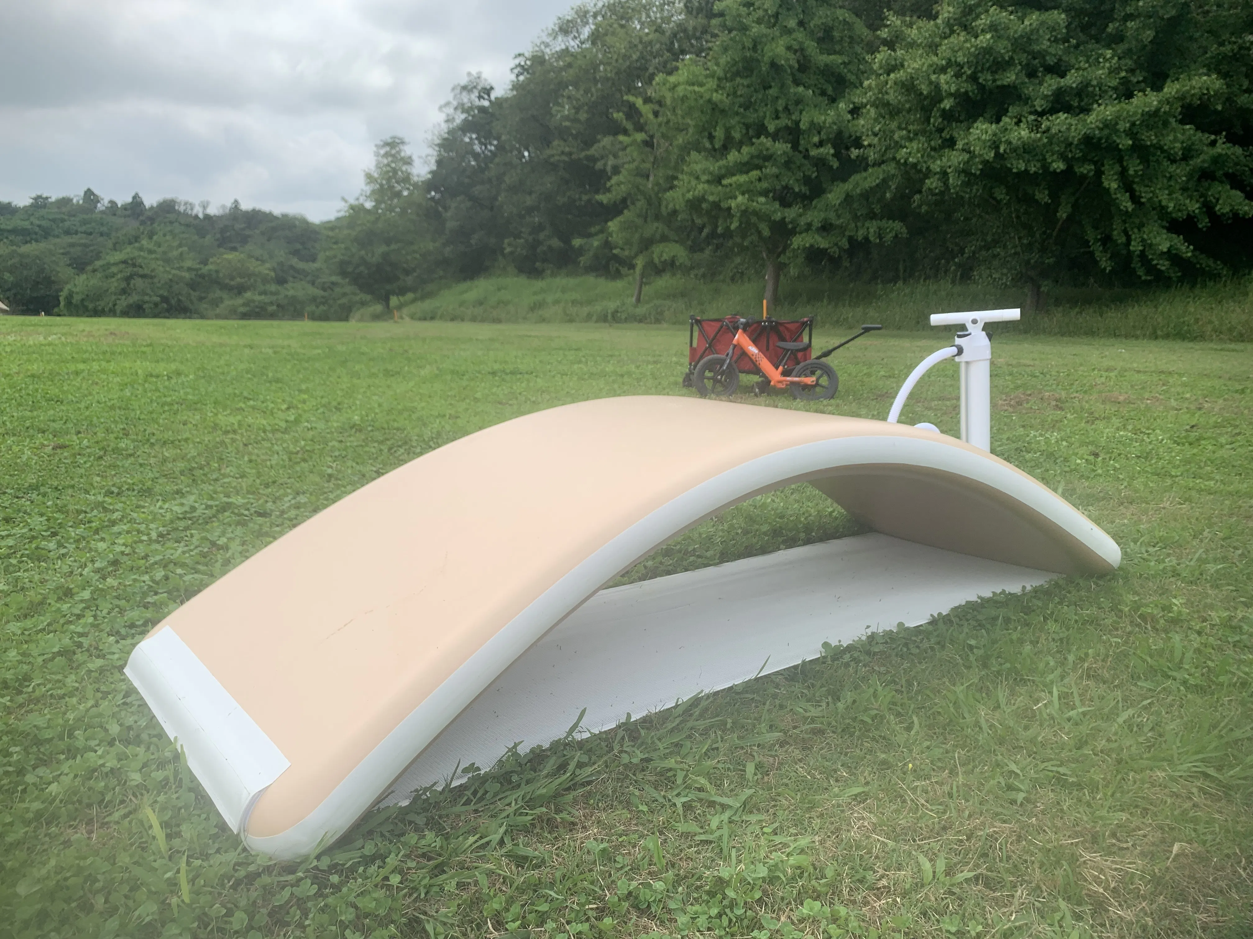 大人がテントやタープを組み立てている間に、小学生の子どもにハンモックのエアー入れをお願いしました。