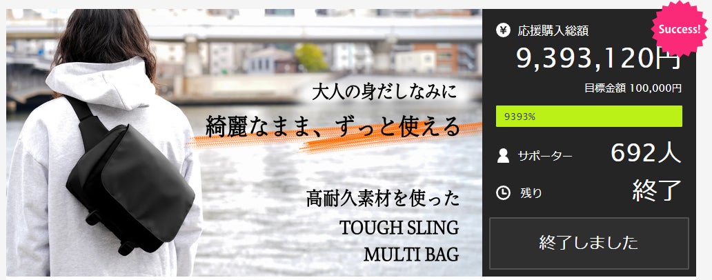 ティザーサイトをご覧頂いた方はご存じの通り、このタフスリングマルチバッグは今年の1月まで他社クラウドファンディングで先行販売を実施し、692名の方から930万円を超えるご支援を頂き、プロジェクトの終了を待たずにリターン全てが完売してしまうほどの人気プロジェクトになりました。