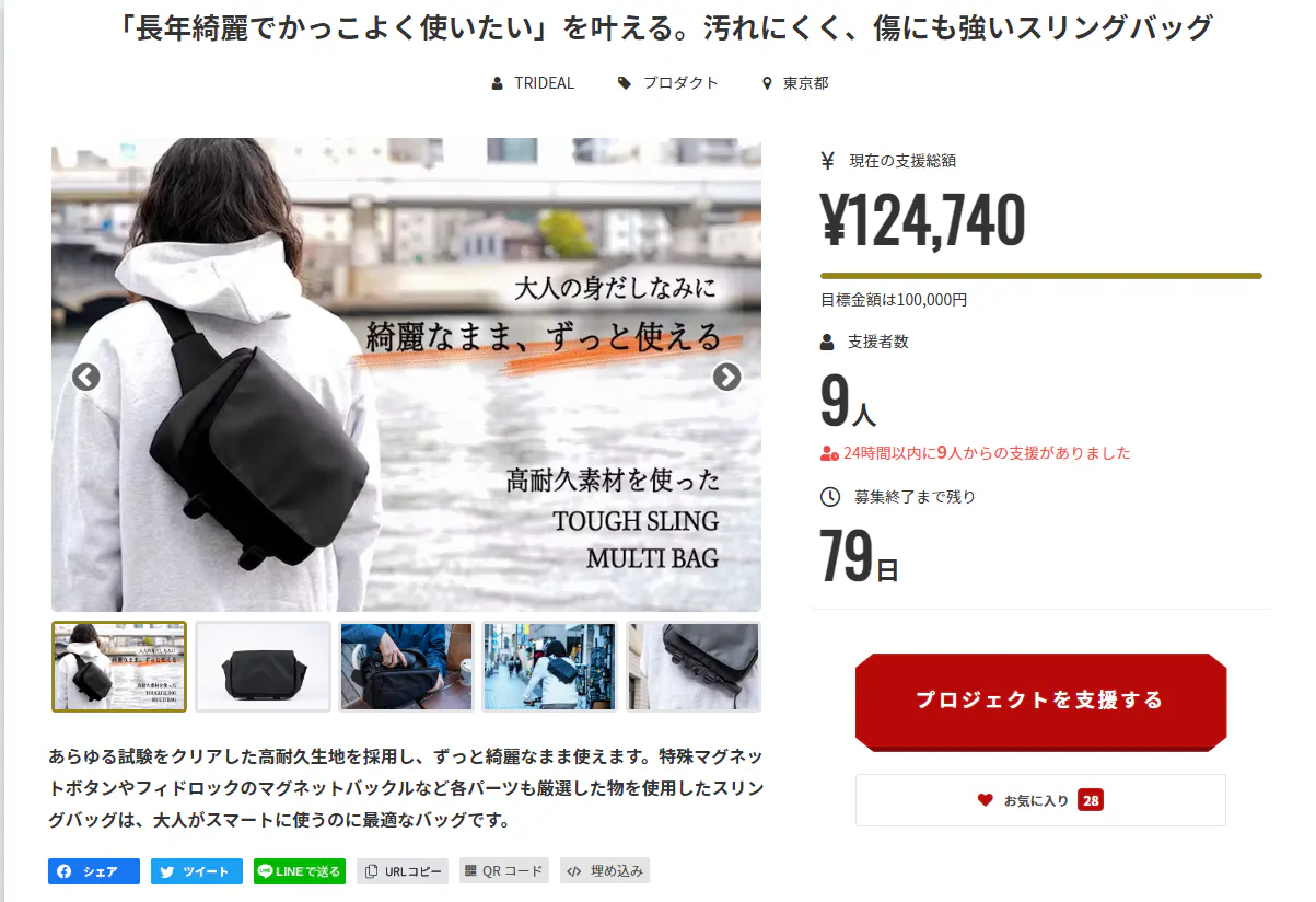 本日12:00にタフスリングマルチバッグのプロジェクトが始まり、開始1時間立たずに目標金額を達成する事が出来ました!