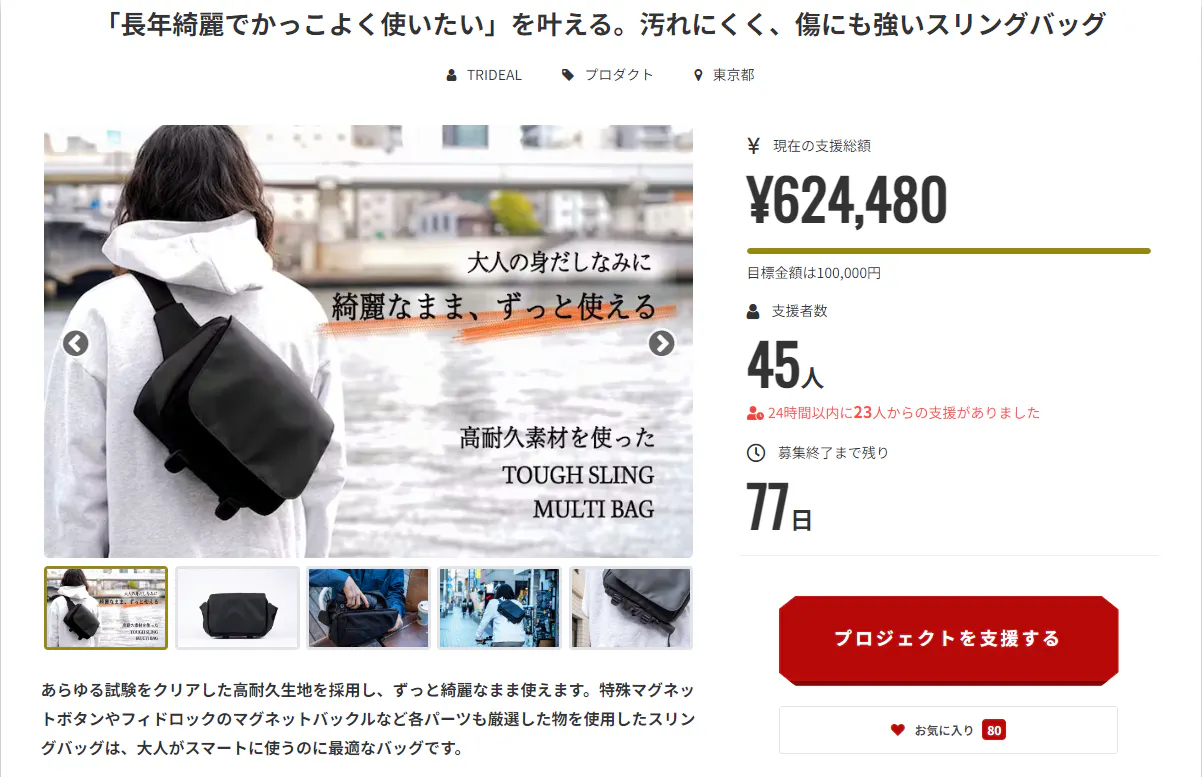ティザーサイトをご覧頂いた方はご存じの通り、このタフスリングマルチバッグは今年の1月まで他社クラウドファンディングで先行販売を実施し、692名の方から930万円を超えるご支援を頂き、プロジェクトの終了を待たずにリターン全てが完売してしまうほどの人気プロジェクトになりました。