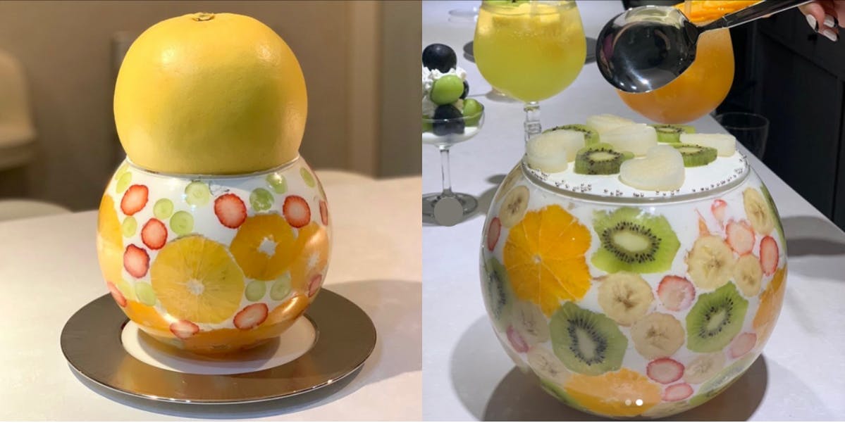 例えば、"晩白柚"(ばんぺいゆ)という柑橘類は、そのまま乗せて(左)お写真を撮ってもらってから、カットして再び盛り付けました。