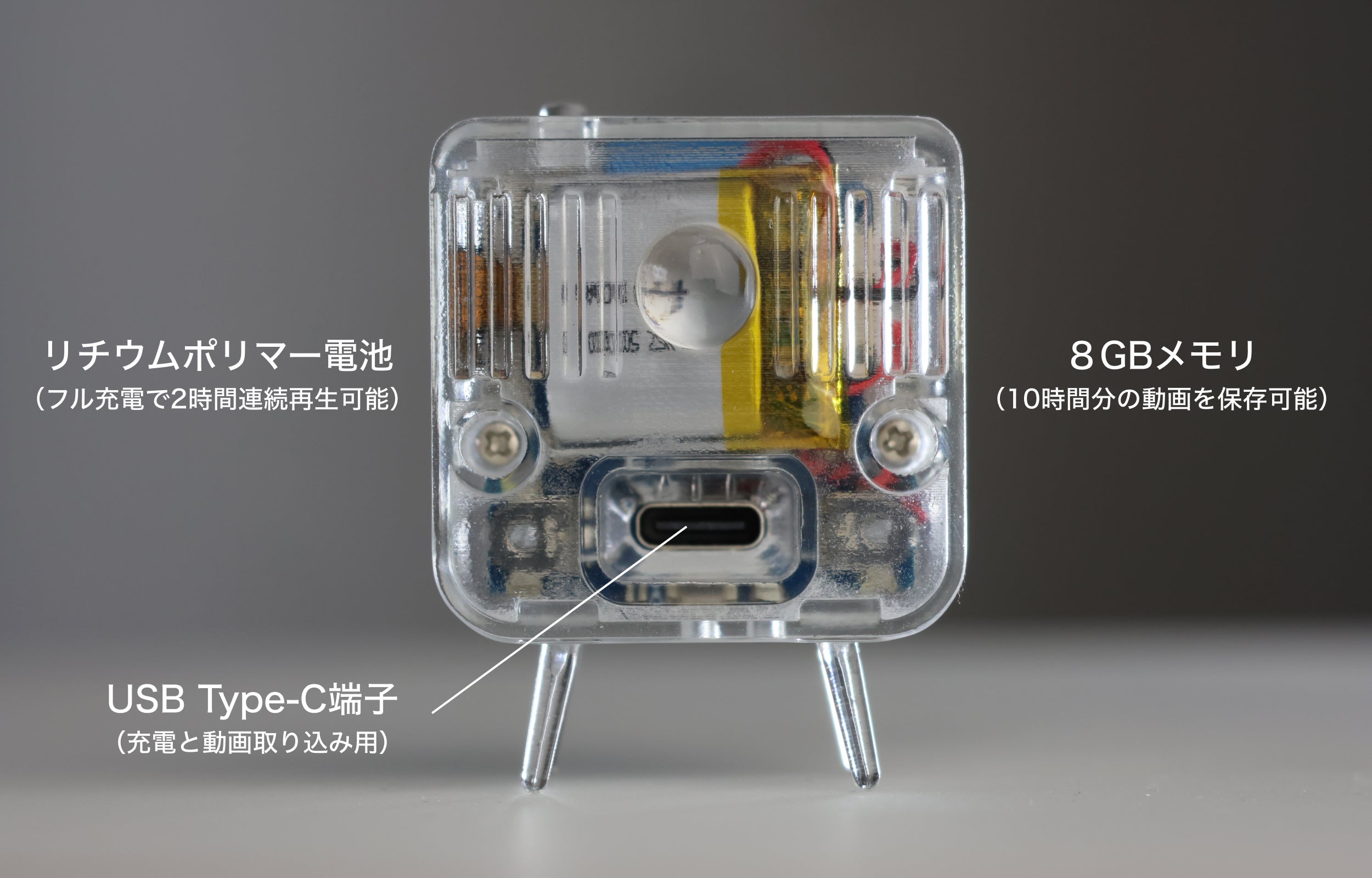 バッテリー :リチウムポリマー3.7V、50mAh、約1時間の連続動画再生が可能