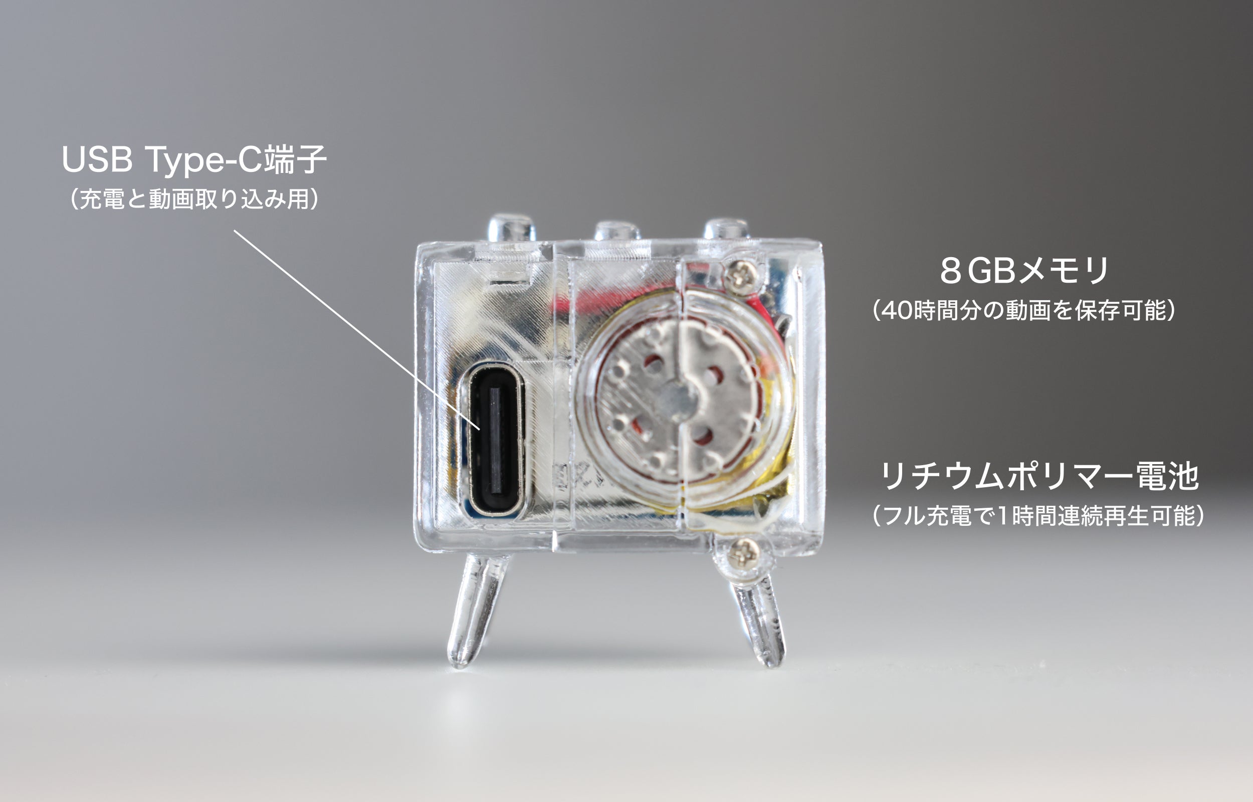 ストレージ: 8GB内蔵、約40時間分の動画が保存可能