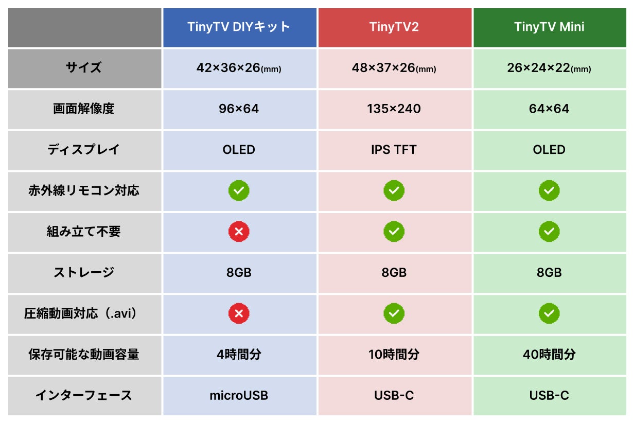 TinyTV各シリーズの比較