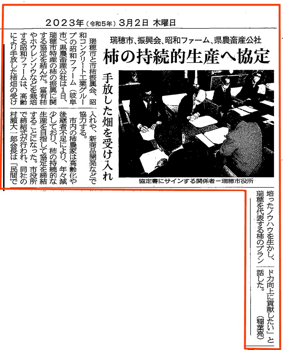 3/1に瑞穂市・瑞穂市柿振興会・岐阜県農産畜産公社と昭和ファームで柿の振興に関する締結を結びました!手放された柿畑を受け入れ、『熟れっ子ちゃん』に活用することで、柿の持続的な生産を目指していきます!応援よろしくお願いします!!