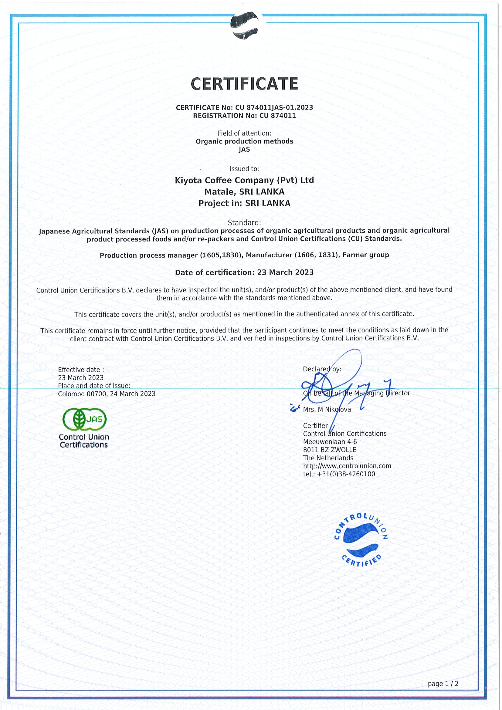 リターンの品は、この度、有機JAS認証が下記承認されました。有機JAS認証コーヒーは、世界のコーヒーの中でも、ごくわずかです。また、このような認証書が公になる機会はごく稀で、有機JASマークのあるコーヒーは高価格のスペシャリティコーヒーです。 キャンプファイヤーのリターン品は、JAS認証コーヒーをお届けします。素晴らしいニュースです。