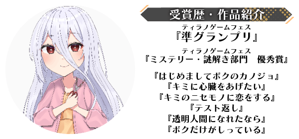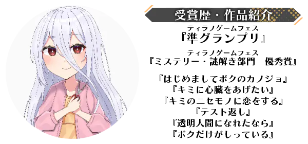 ティラノゲームフェスにて、『準グランプリ』『ミステリー・謎解き部門 優秀賞』を受賞する活躍をしております。