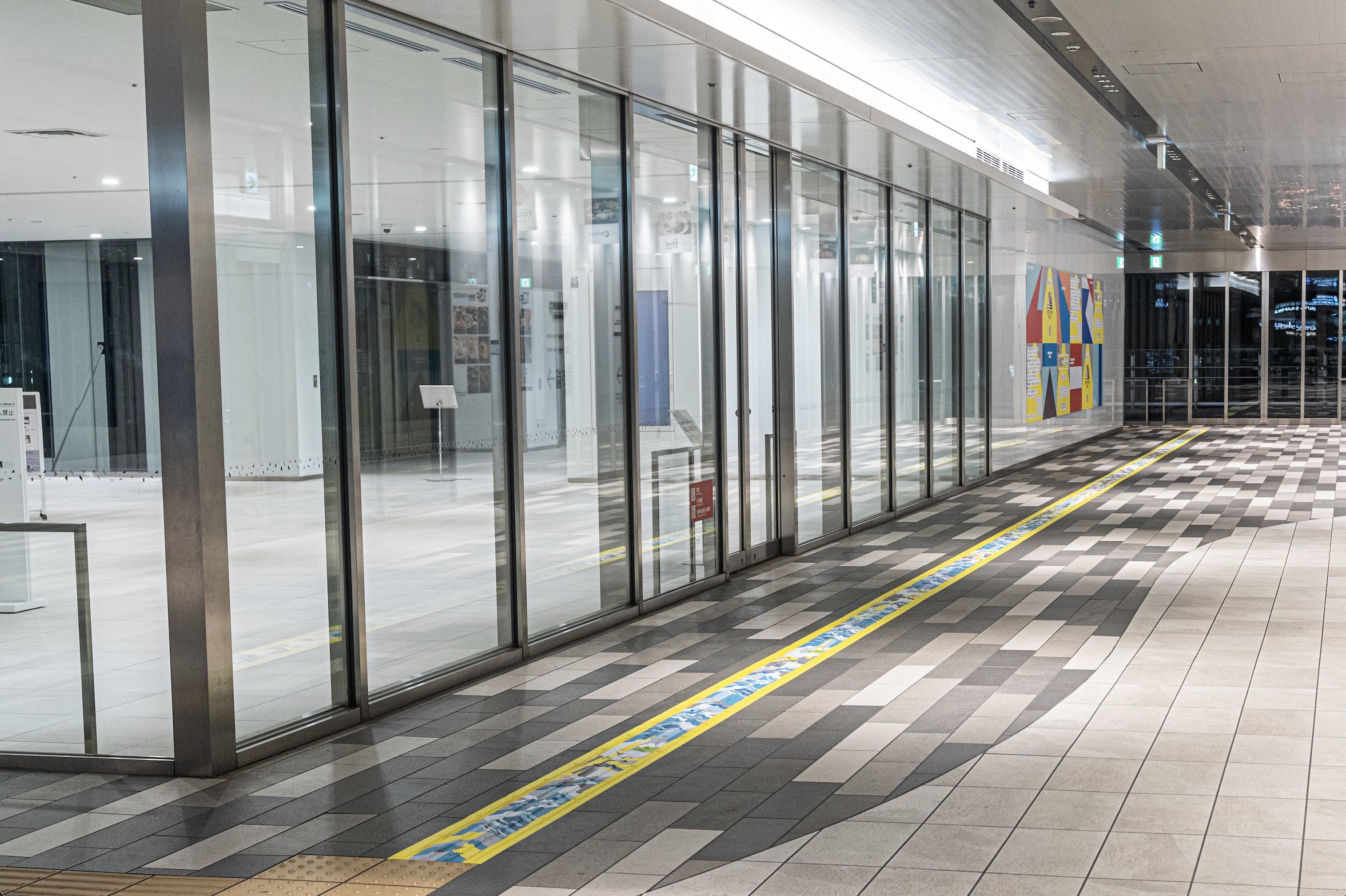 弱視の方へのヒアリングや検証を踏まえて、STREET ART LINEのい視点と終点は、黄色の点字ブロックを設置し、誘導ブロックの両側も黄色にすることで、道としてより認識しやすいデザインを採用しています。