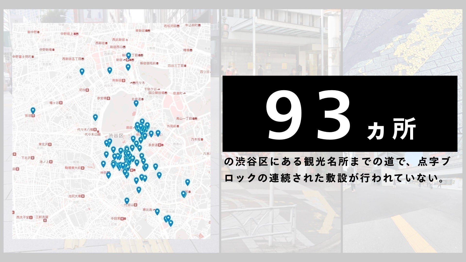 渋谷区観光協会が掲載する観光名所のうち、93ヶ所もの場所が点字ブロックが連続して敷設されてないことが分かりました。