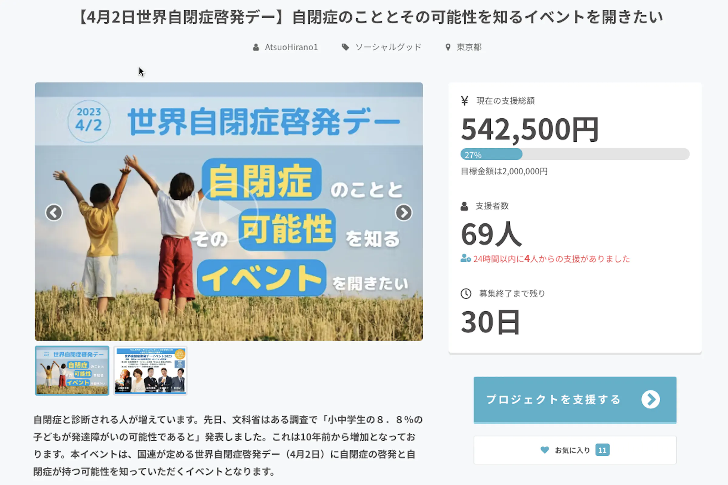 2月19日現在542,500円となりました!達成率27%!