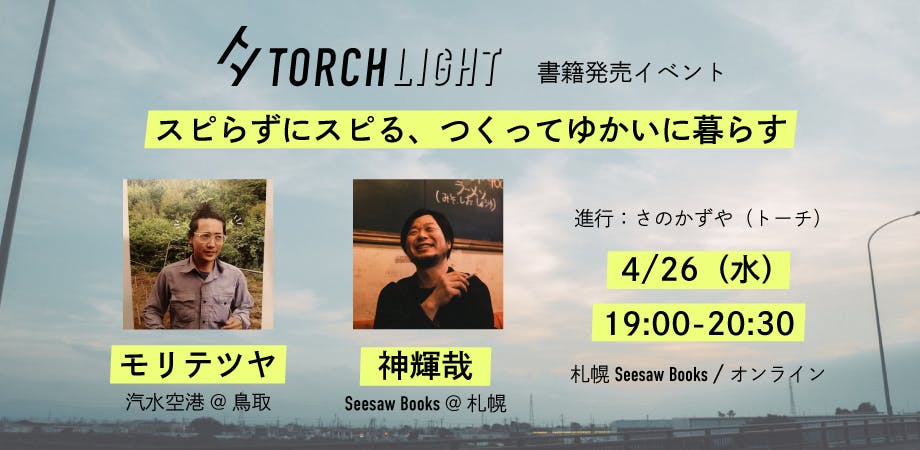 2023/03/31 19:46こんにちは!トーチのさのです。イベント詳細決定!前回の活動報告でお伝えした、4/26(水)のトークイベントにつきまして、詳細が決定しました!鳥取で「汽水空港」という書店を運営しているモリテツヤさんをお呼びして、シーソーブックスで開催します。タイトルは「スピらずにスピる、つくってゆかいに暮らす」。もちろんモリさんは札幌現地参加です!「スピらずにスピる」というのは、モリテツヤさんが最近発信している内容。そのことと、トーチが掲げている「どこに住んでいても、つくってゆかいに暮らす」ということには、なにか関係がありそうな気がしています。それが何なのかを解き明かす会にできればと思っています。詳細、ご予約はPeatixからどうぞ!:https://peatix.com/event/3543895/view【重要】イベントにあたっての注意事項今回のイベントは、クラファンでご支援いただいたかた全員、無料でご覧いただけます。ですが、スペースの都合上、現地参加は25名までとさせていただきます。そのため、現地観覧をご希望のかたは、ご支援いただいた方でも、必ずPeatixから申し込みをお願いいたします。無料のチケットがありますので、そちらをご確認ください。また、クラファンからご支援いただいていない方は有料でご覧いただけます。Peatixからお申し込みをお願いいたします。書籍付きのプランもありますので、もし周りにご興味のある方がいらっしゃいましたらご案内をお願いします。ほか、疑問点などございましたら hello@torch-inc.jp か、このクラファンのメッセージ機能などでお問い合わせください!みなさんのご参加お待ちしております!よろしくお願いいたします! もっと見る