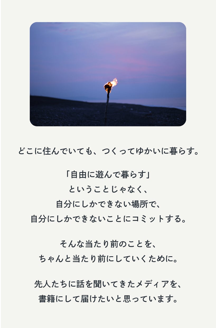 この国のどこかで、つくってゆかいに暮らしている人、暮らしていきたい人と、この書籍を通じて関わりを持ちたい。せっかくなので、自分たちがやってきたこと、やっていること、できることも全部お見せしたい。そういう機会にしたい。