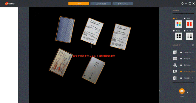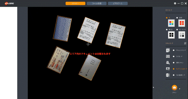 名刺やレシートなどこまごました印刷物をマット上に並べて一括でスキャンし、データとしては1枚ずつ保存できる機能です。