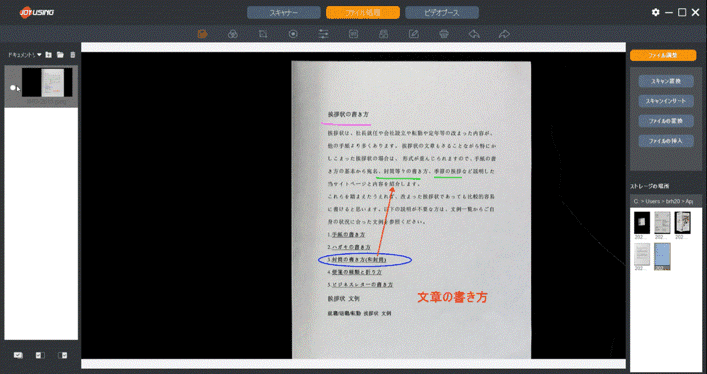 スキャンした画像に手書き風の書き込みや、ワープロ文字を打ち込める機能です。スキャンした文章にマークをした時やメモ書きしたい時に使うと大変便利。