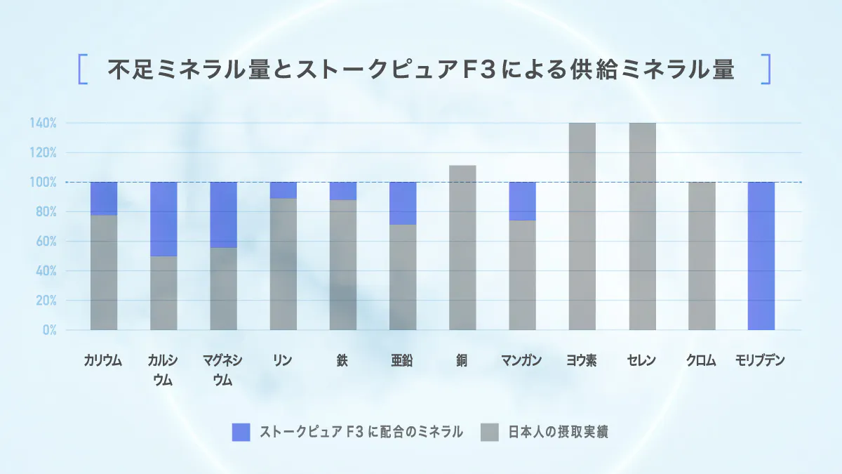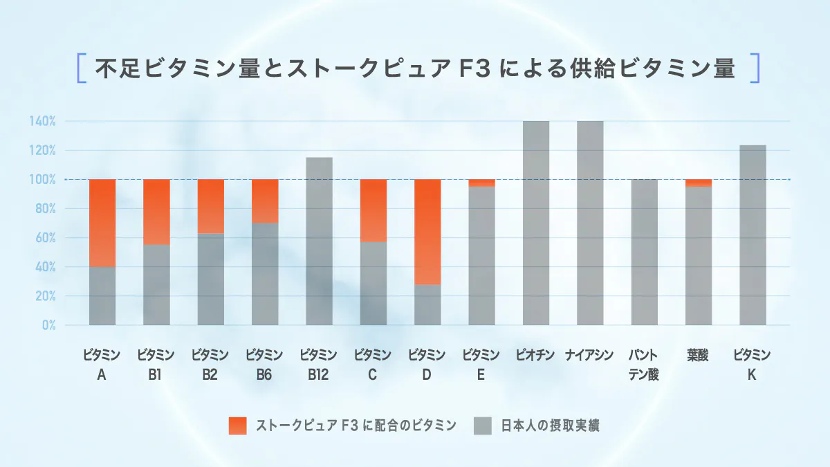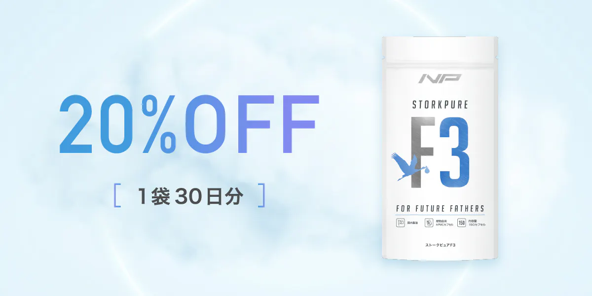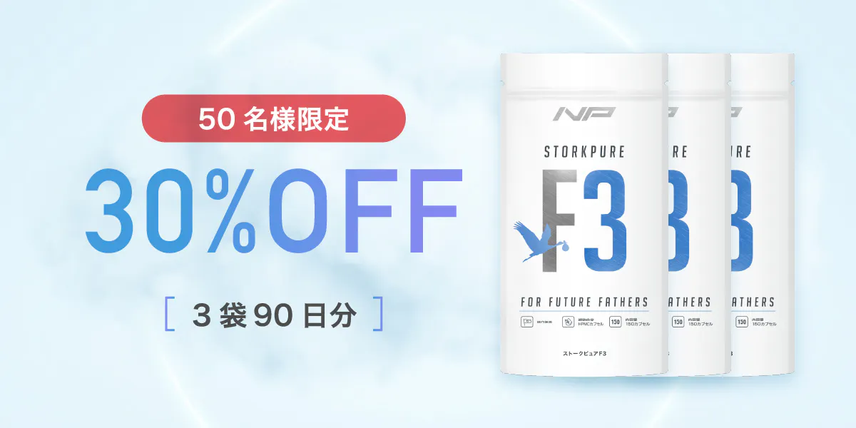 効率的かつ精力的に男性妊活に取り組むためには、基礎栄養素の摂取も大切です。とはいえ日々のお食事から必要な栄養素を完全に摂取しきるのは非常に困難。ストークピュアF3は、ビタミンとミネラルを日本人の栄養摂取実績に基づき、過剰摂取にならないよう不足している分のみ配合。