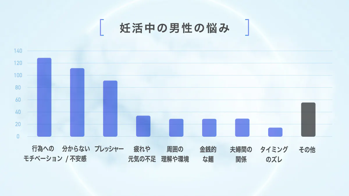 妊活経験男性500名を対象にに妊活中の悩みをアンケート調査(※ソース2)したところ、一番の悩みは「行為へのモチベーション」にあるという結果となりました。