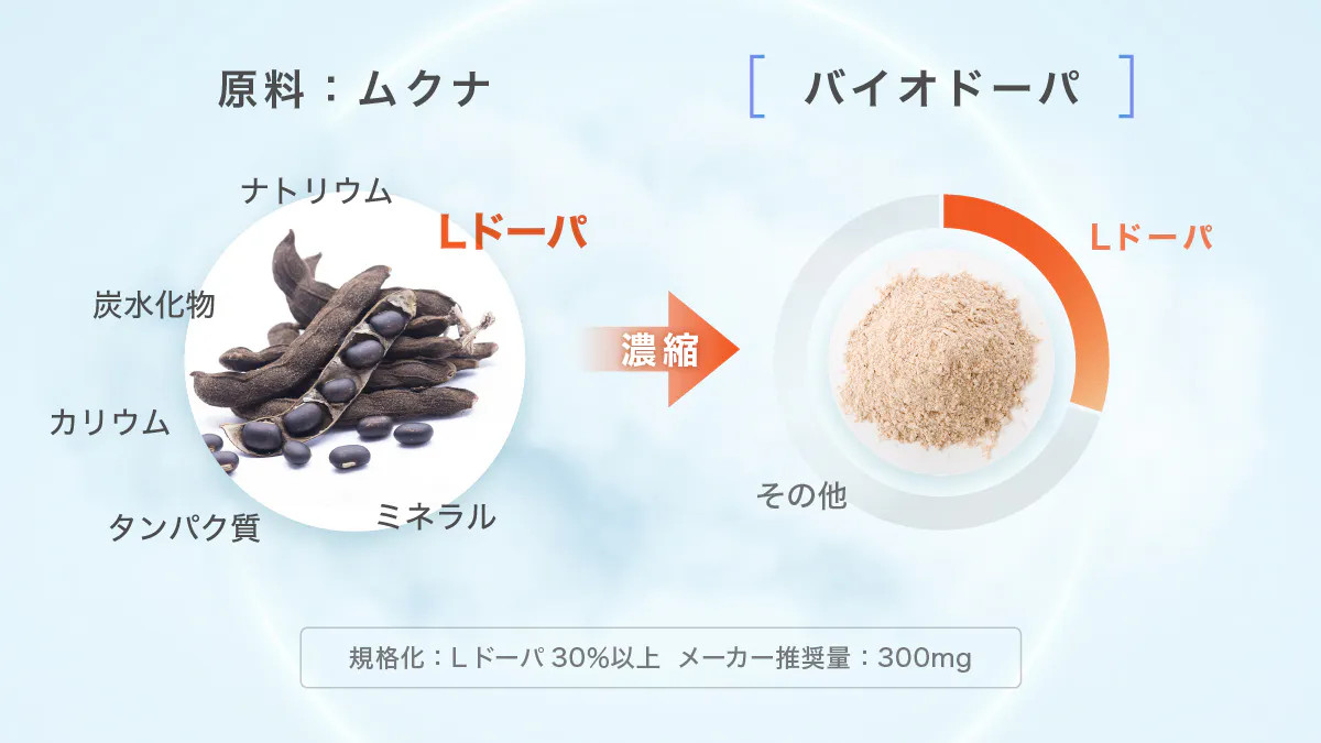 バイオドーパとはムクナ豆(ハッショウマメ)と呼ばれるマメ科の植物に含まれる有用成分であるLドーパを高濃度抽出した規格化素材。Lドーパとはやる気ホルモンとも呼ばれるドーパミンやアドレナリンの前駆体であり、モチベーションサポートにおいて優れた先端素材。Lドーパを30%濃度で規格化しており、海外では妊活をはじめとするメンズヘルスケア領域で注目されています。