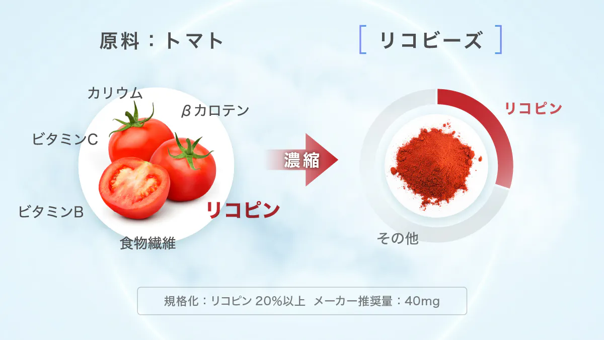 保護する力が強いリコピンですが、実はサプリメント化した場合の品質維持が非常に難しいと言われております。リコビーズはリコピンをビーズ製剤化して安定性を高めた先端素材。世界トップレベルの天然カロチノイドのメーカーであるライコレッドナチュラルプロダクツ社によって開発されており、最高品質のトマトから抽出されたリコピンを20%濃度で規格化しております。
